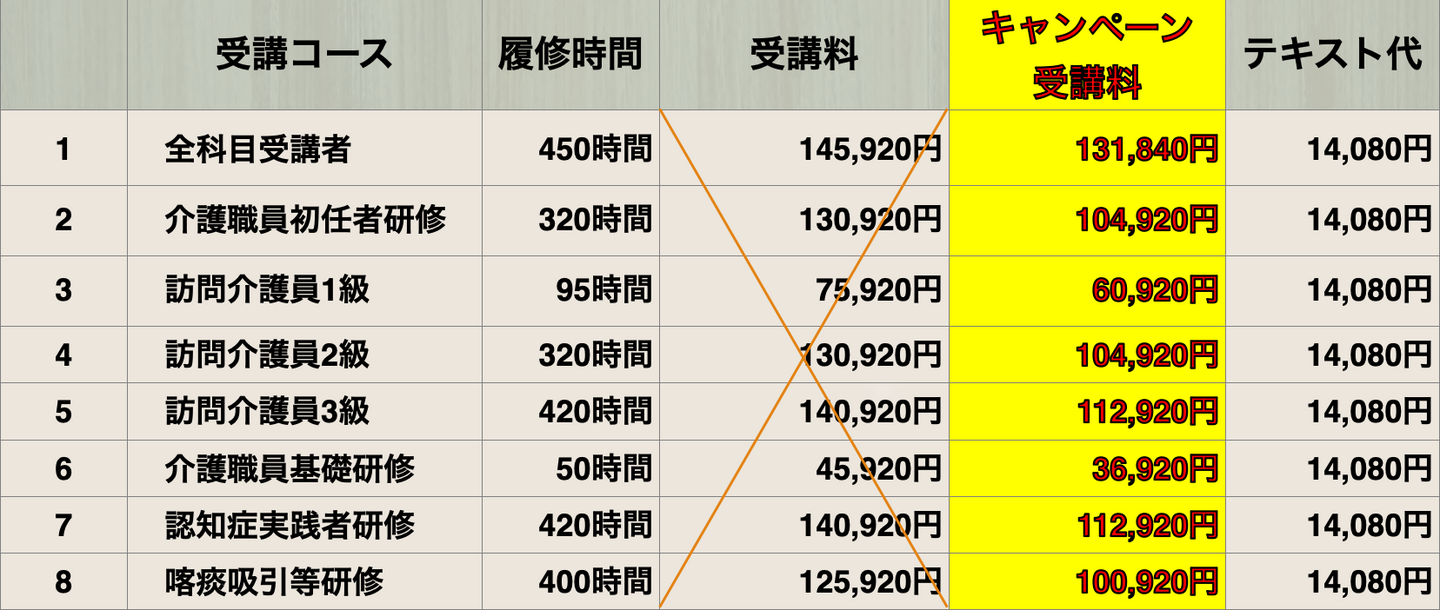 ※上記金額は介護職員基礎研修を修了している場合の受講料(消費税・テキスト代別)です。その他、修了している研修等によって受講料が異なります。