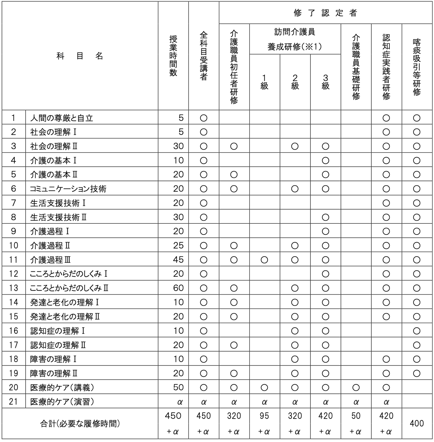 注)上記表の○印は履修する科目、αは医療的ケアのスクーリング3日間を表しています。